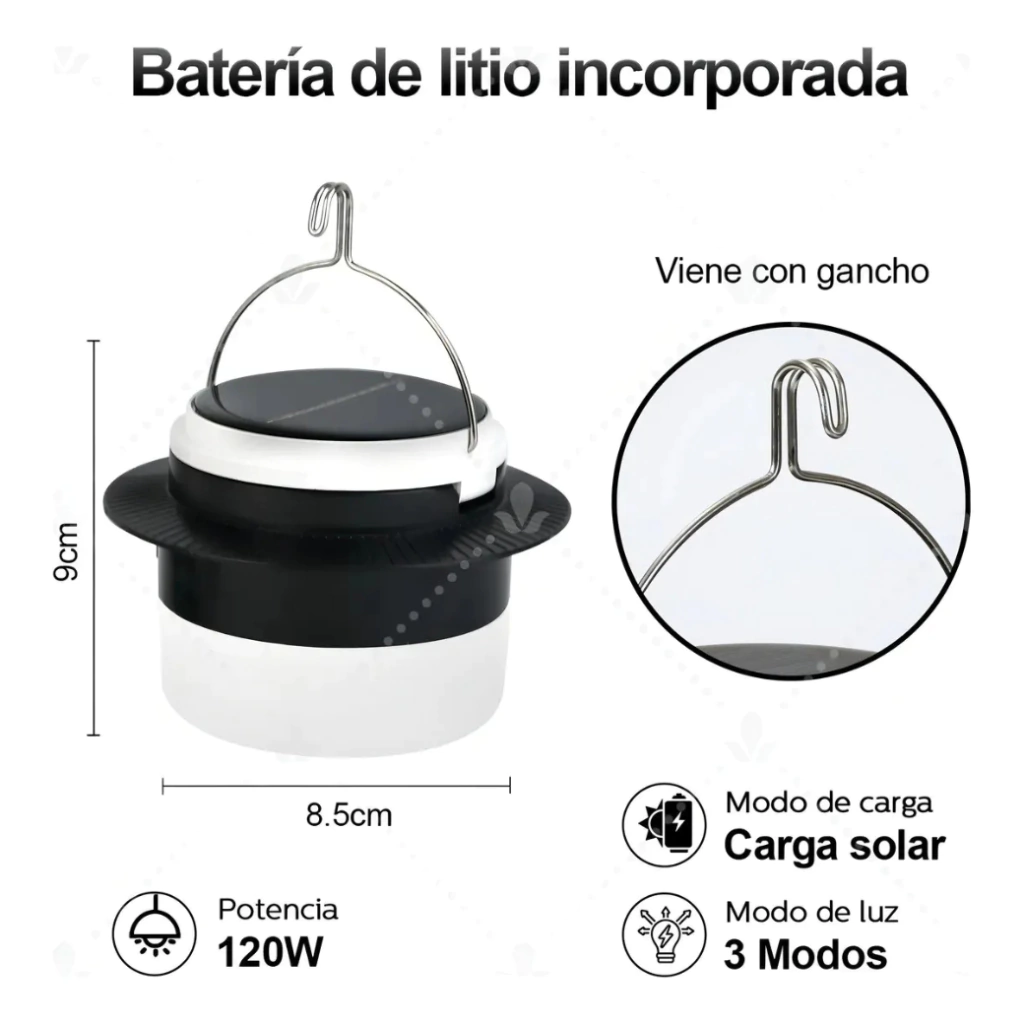 | Potencia de carga | Recargable por energia solar y puerto USB |